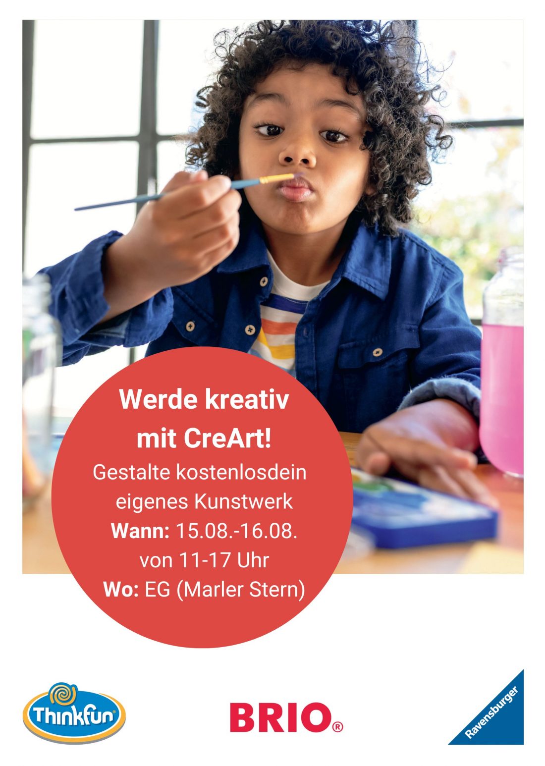 Komm zwischen 11 und 17 Uhr einfach ins Erdgeschoss und lass deiner Kreativität freien Lauf! Ob Malen, Gestalten oder Ausprobieren – hier bist du der Künstler bzw. die Künstlerin!